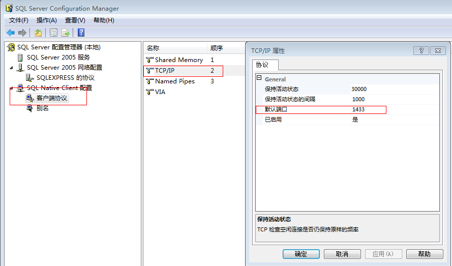 1)展开 SQL Server 2005/2008 网络配置节点-->展开协议节点--> 在协议右边启用 TCP/IP 协议 -->在协议右边的 TCP/IP 协议属性中 --> 在 IPAll 这一项-->将 TCP 端口设置为 1433,